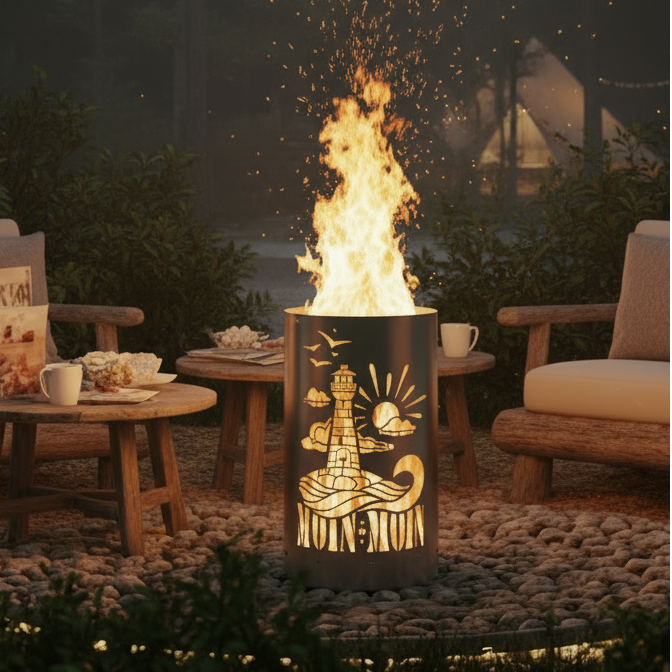 Die Feuertonne mit Leuchtturm-Motiv wird nicht nur zu einem funktionalen Element für gesellige Abende im Freien, sondern auch zu einem dekorativen Highlight. Die fein gearbeiteten Details des Leuchtturms verleihen der Tonne eine maritime Eleganz, die sich harmonisch in verschiedene Garten- und Terrassengestaltungen einfügt.