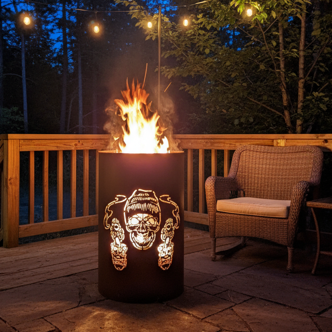 Die düsteren Konturen eines Totenkopfs, kombiniert mit detaillierten Darstellungen von Waffen, verleihen der Feuertonne einen Hauch von Mystik und Abenteuer. Das Design spricht sicherlich Liebhaber des Rock'n'Roll-Lifestyles, Motorrad-Enthusiasten oder Fans des Gothic-Genres an.