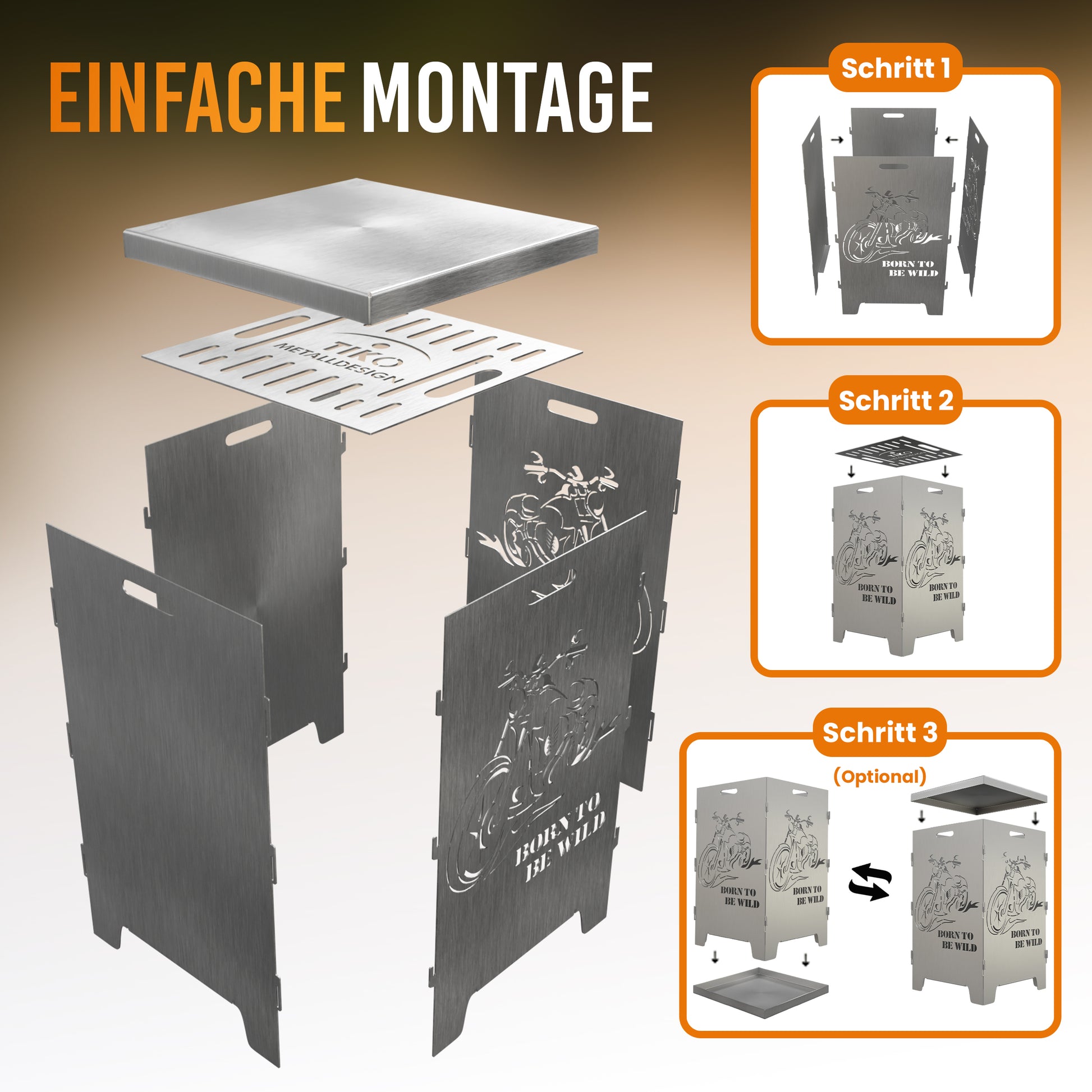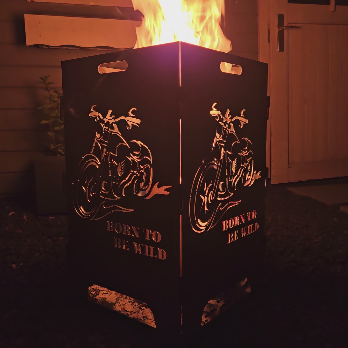 TiKo-Design Feuerkorb mit Chopper Motiv - Born to be wild - 2 Fach Laserung, Zerlegbar, Gartendekoration, Feuerkorb & Sitzgelegenheit